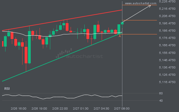 XAUUSD is heading toward the resistance line in a Rising Wedge pattern. If this move continues, the price of XAUUSD could test 5221.2819 within the next 5 hours. It has tested this line many times before, so the move could be short-lived and may rebound as it has before.