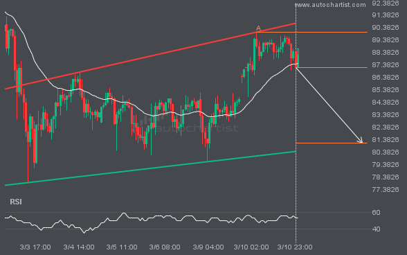 GBPJPY is moving toward a resistance line. Since it has retraced from this line before, we may see either a breakout through it or a rebound to current levels. It has touched this line multiple times in the past 4 days and may test it again within the next 7 hours.