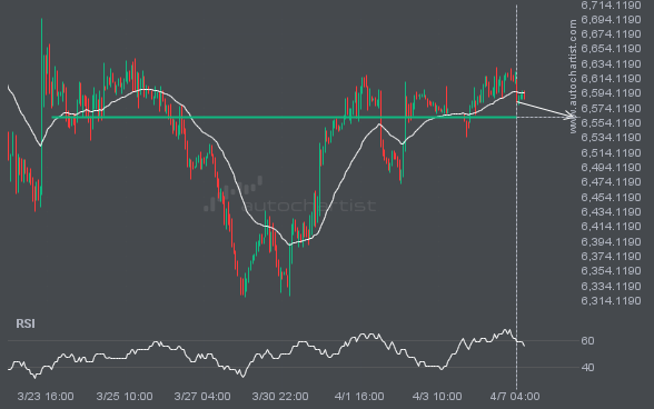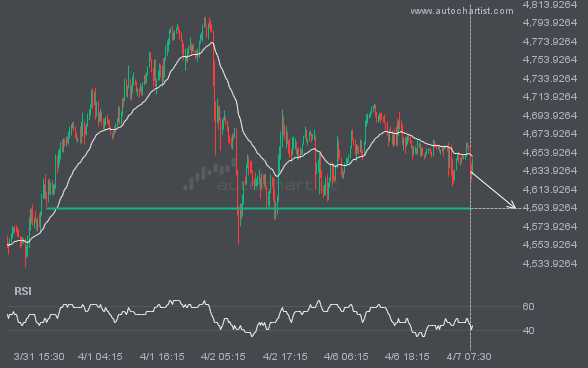 S&P500 is moving toward a support line. Because it has retraced from this level in the past, we may see either a breakout through this line or a rebound to current levels. It has touched this line multiple times over the last 15 days and may test it again within the next 3 days.