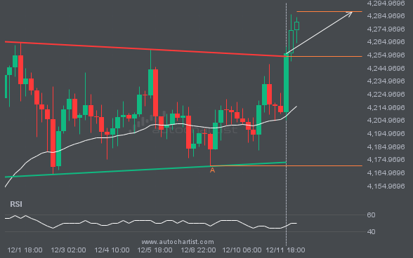 Rectangle pattern identified on XAUUSD has broken through a resistance level, with price momentum continuing to move upward. This presents a solid trading opportunity, with the price expected to reach 4288.2445 in the next 3.