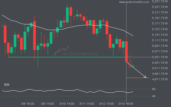 XAUUSD has broken through a support line. Because it has previously retraced from this price, you should wait for confirmation of the breakout before trading. It has touched this line multiple times over the past 9 days, which suggests a possible target around 4977.4375 within the next 2 days.