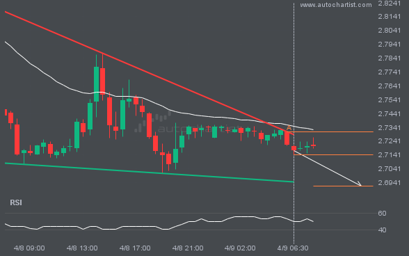 NGC/USD was identified around 2.714 after recently rebounding off the resistance on the 30 Minutes interval. Ultimately, the stock’s price action has formed a Falling Wedge pattern. This squeeze may increase the chances of a strong breakout. The projected move could take the price to around 2.6916.
