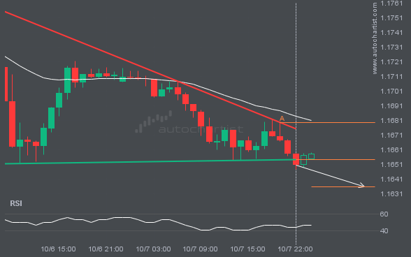 This trade setup on EURUSD is formed by a period of consolidation; a period in which the price primarily moves sideways before choosing a new direction for the longer term. Because of the bearish breakout through support, it seems to suggest that we could see the next price move to 1.1636.