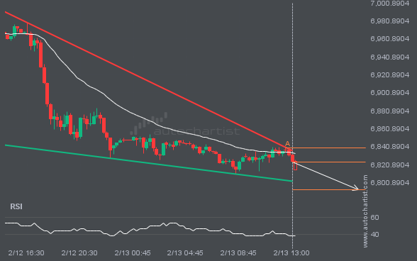 S&P500 is moving toward a support line. Since it has retraced from this line before, we may see either a breakout through it or a rebound to current levels. It has touched this line multiple times in the past 2 days and may test it again within the next 6 hours.