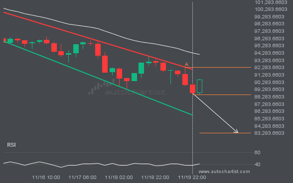 BTCUSD is moving toward a support line. Since it has retraced from this line before, we may see either a breakout through it or a rebound to current levels. It has touched this line multiple times in the past 5 days and may test it again within the next 2 days.