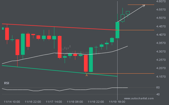 NGC/USD has moved through the resistance line of a Flag pattern at 4.433833333333334 on the 4 hour chart. This line has been tested multiple times in the past, and this breakout could signal an upcoming change in the current trend. Price may continue in the current direction toward 4.5856.