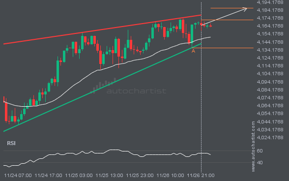 FTSE100 has broken through a line at 9604.7500. If this breakout holds, we could see the price of FTSE100 move toward 9659.9902 within the next 12 hours. However, don’t be too quick to trade. It has tested this line many times in the past, so confirm the breakout before placing any trades.