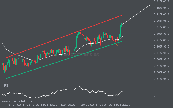 XAUUSD is moving toward a support line. Since it has retraced from this line before, we may see either a breakout through it or a rebound to current levels. It has touched this line multiple times in the past 5 days and may test it again within the next 17 hours.