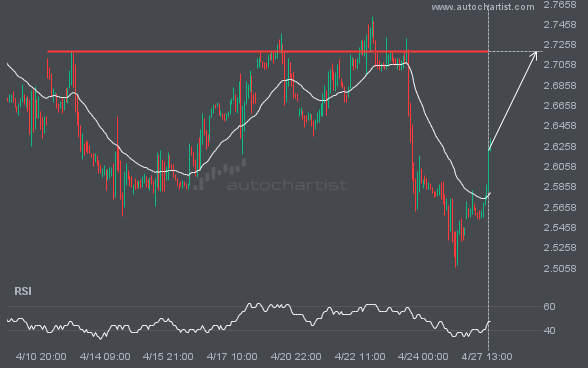 NGC/USD is moving toward a resistance line. Because it has retraced from this level in the past, we may see either a breakout through this line or a rebound to current levels. It has touched this line multiple times over the last 15 days and may test it again within the next 3 days.