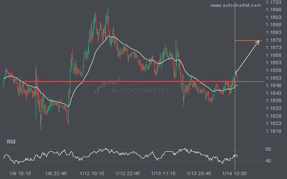 EURUSD has broken through a resistance line. Since it has previously retraced from this price, wait for confirmation of the breakout before trading. It has touched this line several times over the past 6 days. This suggests a possible target around 1.1677 within the next 17 hours.