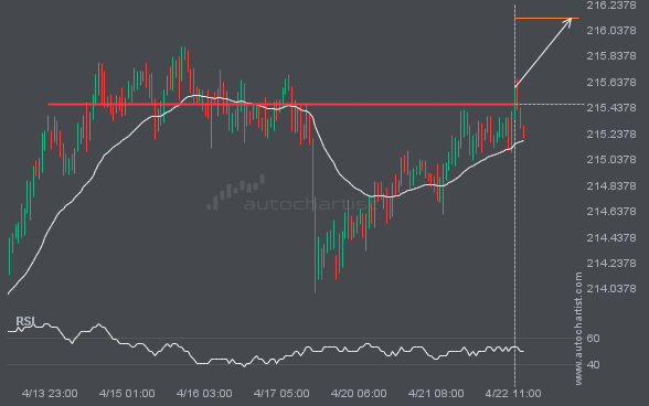 BRN/USD has broken through the support line of a Triangle technical chart pattern. Because it has retraced from this line in the past, you should wait for confirmation of the breakout before taking any action. It has touched this line twice in the last 5 days, which suggests a possible target around 92.8832 within the […]