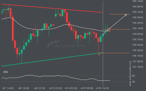 USDJPY was identified around 159.1315 after recently rebounding off the support on the 4 hour interval. Ultimately, the stock’s price action has formed a Triangle pattern. This squeeze may increase the chances of a strong breakout. The projected move could take the price to around 159.6782.