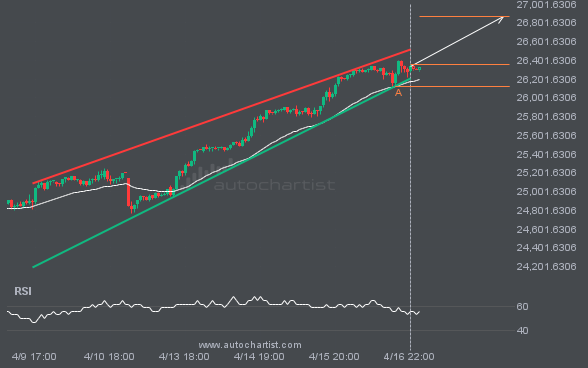 An emerging Channel Up pattern has been detected for NAS100 on the 1 hour chart. There may be a move toward 26867.8875 in the next few candles. Once it reaches the resistance, it may continue its bullish run or revert to current price levels.