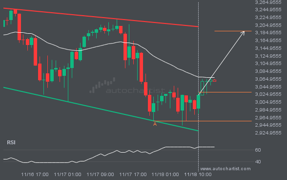 A Channel Down pattern was identified for ETHUSD at 3030.84, suggesting it may move toward the resistance line at 3189.6250. It may break through that line and continue the bullish trend, or reverse from it.