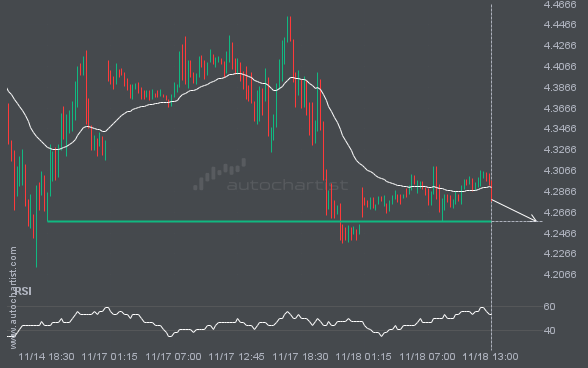NGC/USD is approaching the line at 4.2575. If this move continues, the price of NGC/USD could test 4.2575 within the next 10 hours. But do not rush to trade. It has tested this line many times in the past, so the move could be short-lived and end in a rebound.