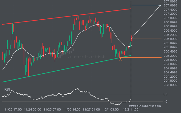 GBPJPY is moving toward a resistance line it has tested many times. It has retraced from this line before, so it’s unclear whether it will break through or rebound again. If GBPJPY continues on its current trajectory, it could reach 207.7151 within the next 3 days.