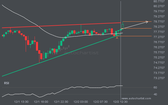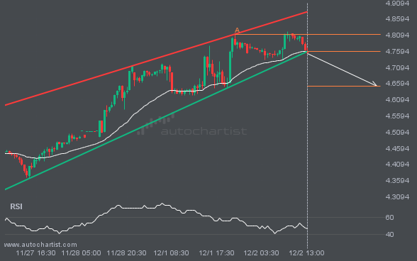 USDJPY is moving toward a support line. Since it has retraced from this line before, we may see either a breakout through it or a rebound to current levels. It has touched this line multiple times in the past 18 days and may test it again within the next 2 days.