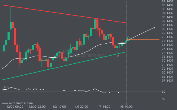 XAGUSD is moving toward a resistance line. Since it has retraced from this line before, we may see either a breakout through it or a rebound to current levels. It has touched this line multiple times in the past 28 days and may test it again within the next 3 days.