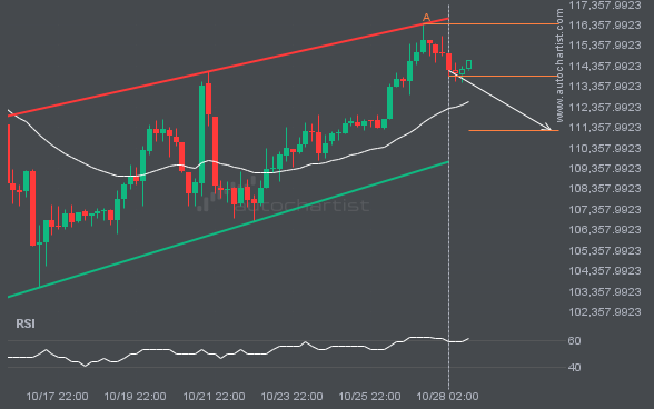 Emerging Channel Up detected on BTCUSD – the pattern is an emerging one and has not yet broken through resistance, but the price is expected to move up over the next few hours. The price at the time the pattern was found was 113855.65 and it is expected to move to 111185.6932.