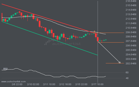 GBPJPY is moving toward a support line. Since it has retraced from this line before, we may see either a breakout through this line or a rebound to current levels. It has touched this line numerous times in the last 13 days and may test it again within the next 2 days.