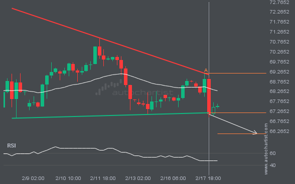 The last 12 4 hour candles on BRN/USD have formed a Descending Triangle pattern and broken out through the pattern lines, indicating a possible bearish movement toward the price level at 66.1395.