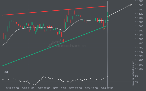 EURUSD is moving toward a resistance line it has tested many times. It has retraced from this line before, so it’s unclear whether it will break through or rebound again. If EURUSD continues on its current trajectory, it could reach 1.1665 within the next 22 hours.