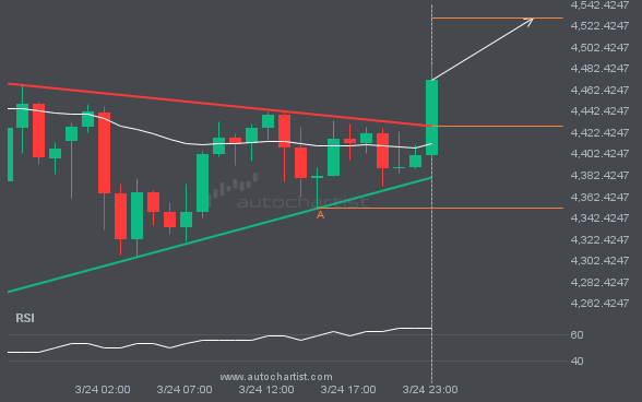 XAUUSD has broken through the resistance line of a Triangle technical chart pattern. Because it has retraced from this line in the past, you should wait for confirmation of the breakout before taking any action. It has touched this line twice in the last 2 days, which suggests a possible target around 4529.5972 within the […]