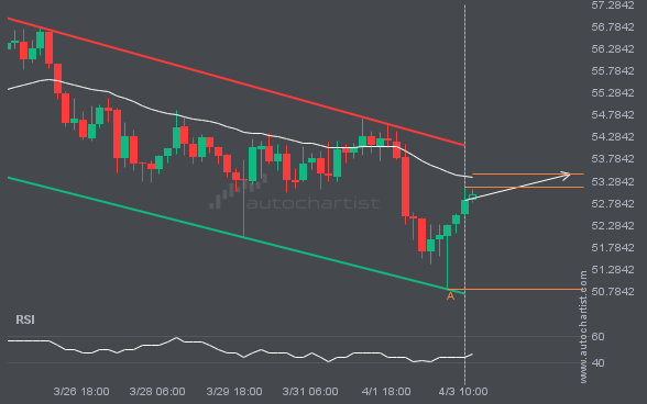 FTSE100 has broken through a resistance line. Because it has previously retraced from this price, you should wait for confirmation of the breakout before trading. It has touched this line multiple times over the past 23 days, which suggests a possible target around 10685.2363 within the next 2 days.
