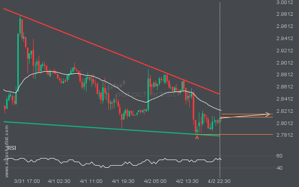 NGC/USD is moving toward a resistance line. Since it has retraced from this line before, we may see either a breakout through this line or a rebound to current levels. It has touched this line numerous times in the last 3 days and may test it again within the next 17 hours.