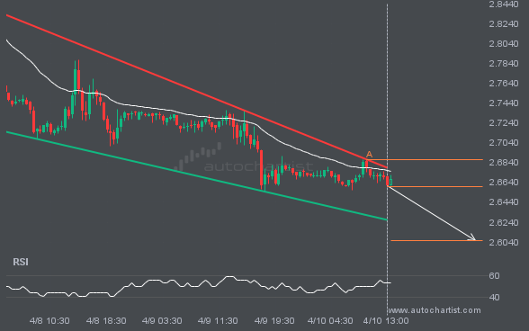 NGC/USD is moving toward a support line. Since it has retraced from this line before, we may see either a breakout through this line or a rebound to current levels. It has touched this line numerous times in the last 3 days and may test it again within the next 16 hours.