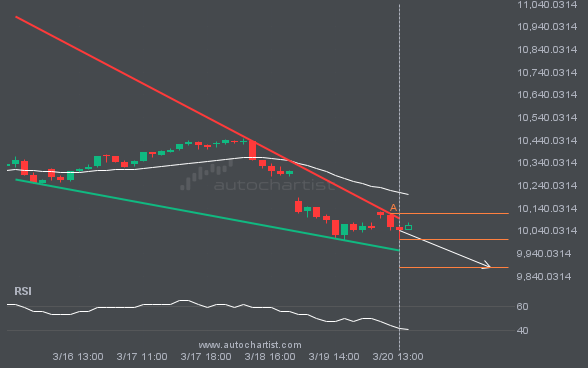 NAS100 is moving toward a resistance line. Since it has retraced from this line before, we may see either a breakout through this line or a rebound to current levels. It has touched this line numerous times in the last 12 days and may test it again within the next 3 days.