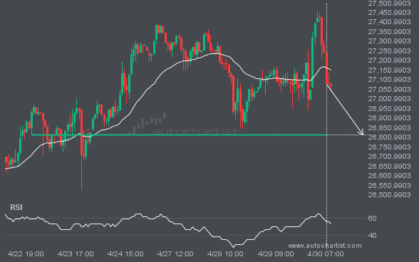 GBPJPY has broken through the support line of a Rising Wedge technical chart pattern. Because it has retraced from this line in the past, you should wait for confirmation of the breakout before taking any action. It has touched this line twice in the last 13 days, suggesting a possible target level around 214.5601 within […]