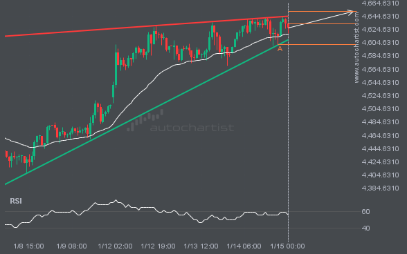 An emerging Rising Wedge pattern in its final wave has been identified on the XAUUSD 1 hour chart. After a strong bullish run, XAUUSD is heading toward the upper triangle trendline, with possible resistance at 4651.5630. If the resistance holds, the Rising Wedge pattern suggests a rebound toward current levels.