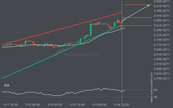 An emerging Rising Wedge pattern in its final wave has been identified on the ETHUSD 1 hour chart. After a strong bullish run, ETHUSD is heading toward the upper triangle trendline, with possible resistance at 3530.3131. If the resistance holds, the Rising Wedge pattern suggests a rebound toward current levels.