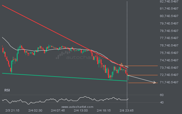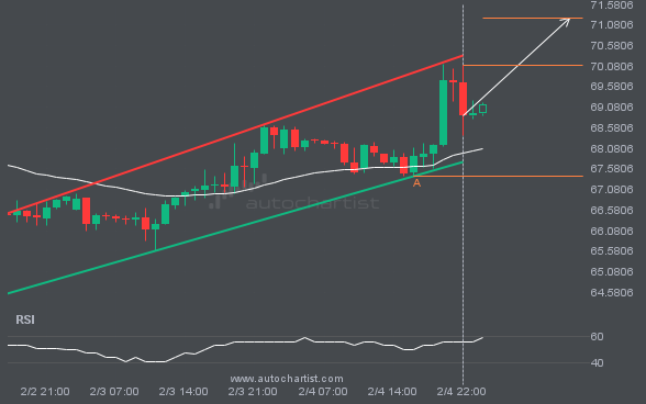BRN/USD is moving toward a resistance line it has tested many times. It has retraced from this line before, so it’s unclear whether it will break through or rebound again. If BRN/USD continues on its current trajectory, it could reach 71.2460 within the next 12 hours.