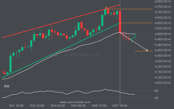 Rising Wedge pattern identified on ETHUSD has broken through a support level with the price momentum continuing to move in an downward direction. A solid trading opportunity continues with the price expected to reach 4345.3579 in the next 2.