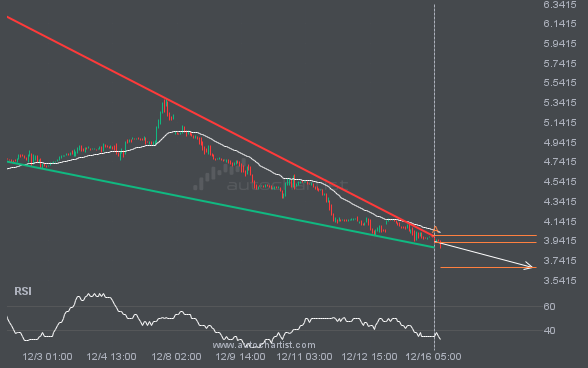 NGC/USD is moving toward a support line. Since it has retraced from this line before, we may see either a breakout through this line or a rebound to current levels. It has touched this line numerous times in the last 20 days and may test it again within the next 3 days.