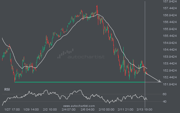 USDJPY is moving toward a support line. Because it has retraced from this level in the past, we may see either a breakout through this line or a rebound to current levels. It has touched this line multiple times over the last 17 days and may test it again within the next 3 days.