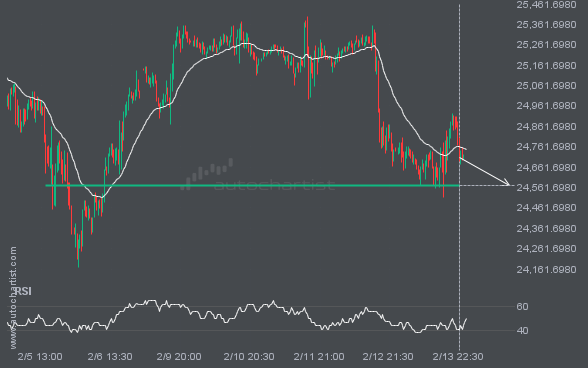 S&P500 is moving toward a support line. Since it has retraced from this line before, we may see either a breakout through it or a rebound to current levels. It has touched this line multiple times in the past 2 days and may test it again within the next 6 hours.
