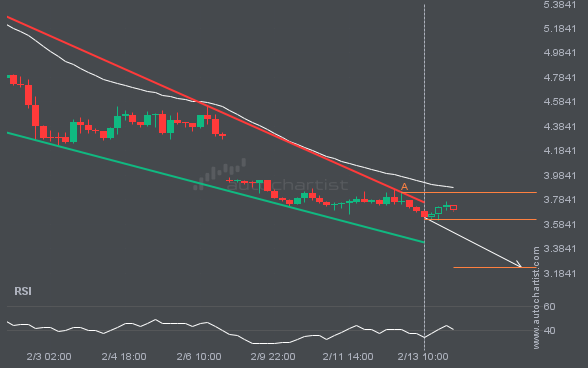 A Falling Wedge pattern was identified for NGC/USD at 3.6205, suggesting it may move toward the support line at 3.2324. It may break through that line and continue the bearish trend, or reverse from it.