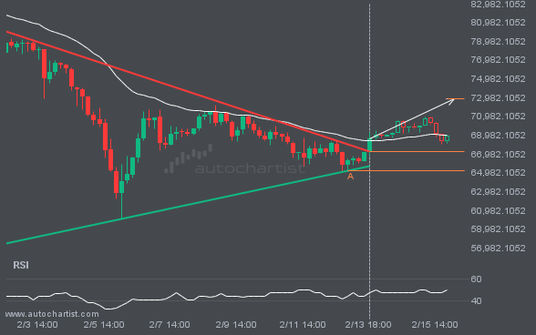 BTCUSD has broken through the resistance line of a Triangle technical chart pattern. Because it has retraced from this line in the past, you should wait for confirmation of the breakout before taking any action. It has touched this line twice in the last 15 days, suggesting a possible target level around 72868.7555 within the […]