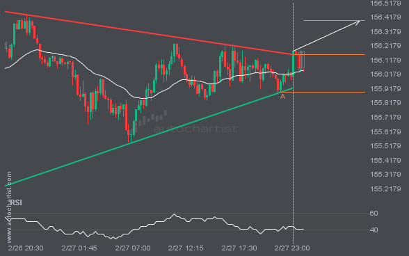 USDJPY has broken through a resistance line of the Triangle chart pattern. If this breakout holds, we may see the price of USDJPY test 156.3917 within the next 7 hours. But don’t rush to trade. It has tested this line before, so confirm the breakout before taking any action.
