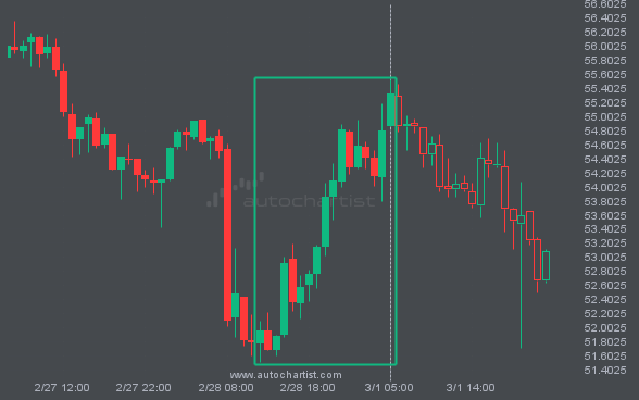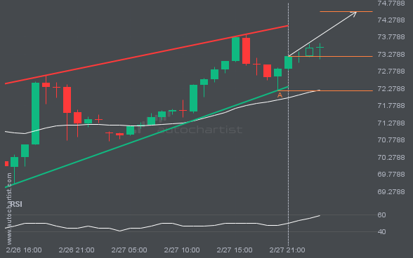 BRN/USD is moving toward a resistance line. Since it has retraced from this line before, we may see either a breakout through it or a rebound to current levels. It has touched this line multiple times in the past 2 days and may test it again within the next 5 hours.