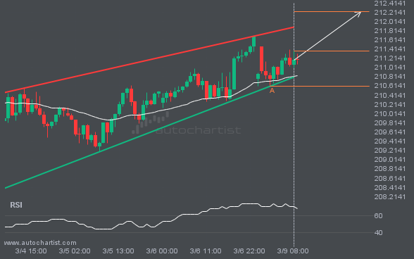 An emerging Rising Wedge pattern has been detected for GBPJPY on the 1 hour chart. There may be a move toward 212.2226 in the next few candles. Once it reaches the resistance, it may continue its bullish run or revert to current price levels.