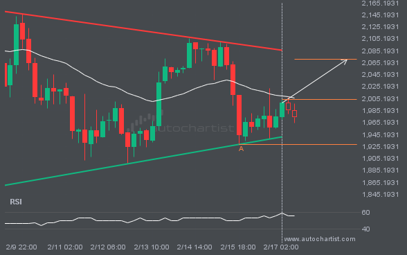 An emerging Triangle has been detected on ETHUSD. The pattern has not yet broken through support, but the price is expected to move up over the next few hours. At the time the pattern was found, the price was 2003.25, and it is expected to move to 2070.8748.