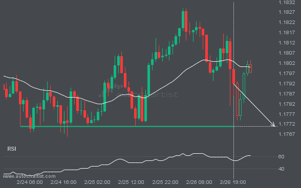 EURUSD is moving toward a support line. Because it has retraced from this level in the past, we may see either a breakout through this line or a rebound to current levels. It has touched this line multiple times over the last 3 days and may test it again within the next 10 hours.