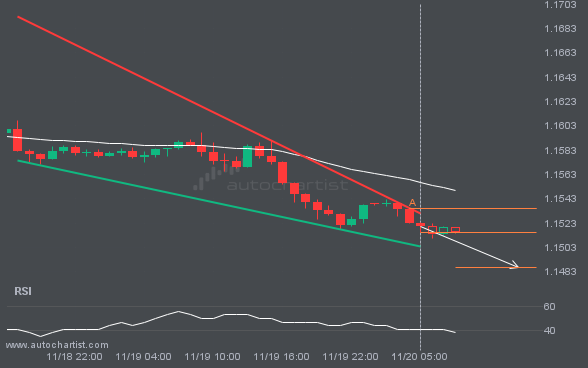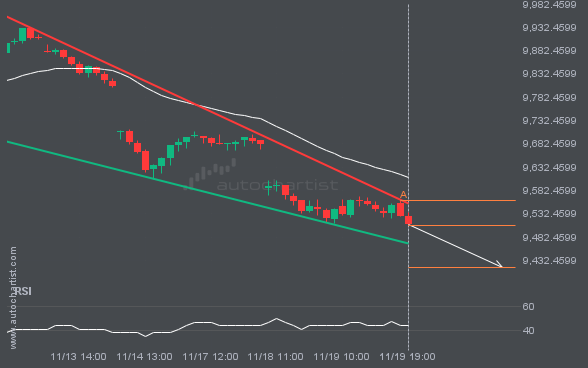 FTSE100 has broken through a support line. It has touched this line at least twice in the last 5 days. This breakout may indicate a potential move to 8399.7202 within the next 6 hours. Because we have seen it retrace from this position in the past, one should wait for confirmation of the breakout before trading.