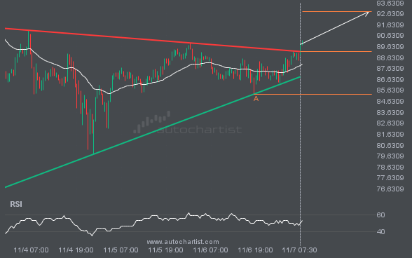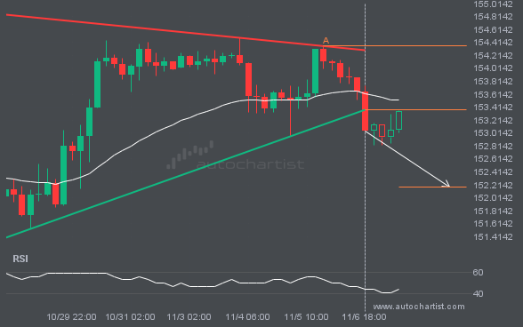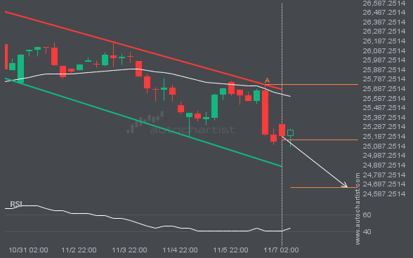 Emerging Channel Down detected on GBPJPY – the pattern is an emerging one and has not yet broken through resistance, but the price is expected to move up over the next few hours. The price at the time the pattern was found was 199.7315 and it is expected to move to 198.2898.