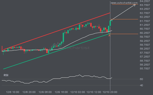 GBPJPY was identified around 208.2395 after recently rebounding off the resistance on the 4 hour interval. Ultimately, the stock’s price action has formed a Channel Up pattern. This squeeze may increase the chances of a strong breakout. The projected move could take the price to around 207.4464.