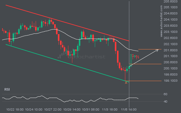 USDJPY is moving towards a support line. Because we have seen it retrace from this line before, we could see either a break through this line, or a rebound back to current levels. It has touched this line numerous times in the last 19 days and may test it again within the next 2 days.